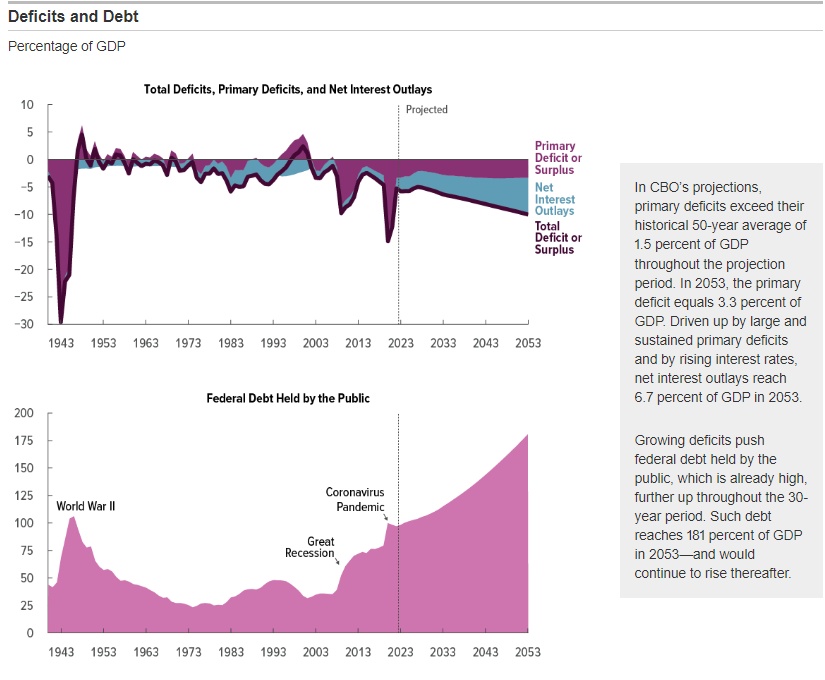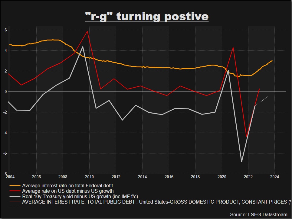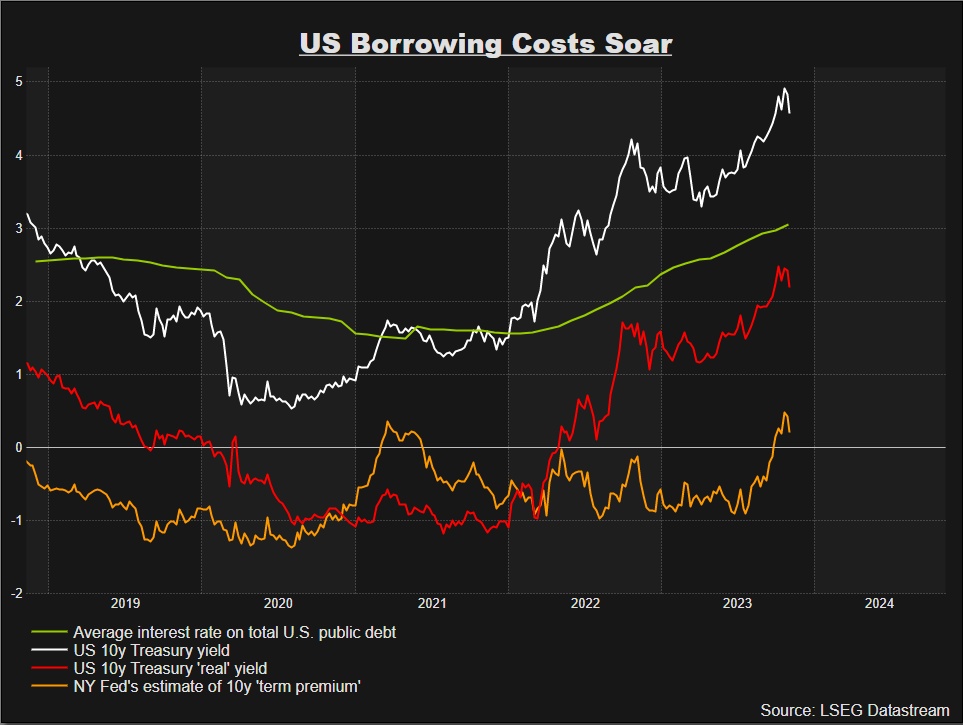 根据美国国会预算办公室(CBO)在6月份——即在最近一次美债收益率飙升之前——的预测和假设,到2053年,美国债务与GDP之比将几乎翻一番,达到180%。这一预测是基于当时3.9%的十年期美债收益率将在30年后升至4.5%,所有美债的平均收益率将从今年的2.7%升至30年后的4%。然而,自6月以来,十年期美债收益率已涨至4.5%,所有美债的平均收益率也已超过3%。