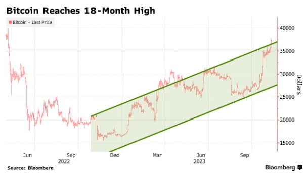 周四,比特币一度逼近3.8万美元,这是自2022年5月以来的最高价。当时,TerraUSD稳定币的崩溃引发了整个行业的一连串暴雷,最终导致FTX交易所的破产。截至发稿,比特币涨0.61%,报37092.8美元。