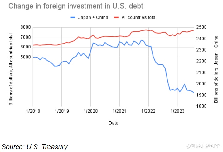 智通财经APP获悉,外国投资者持有的美国国债比例仍然很高,截至2023年第二季度约为30%,这在很大程度上要归功于美国国债的避风港地位。富国银行策略师Jennifer Timmerman和Gary Schlossberg表示,尽管中国和日本的美国国债持有量一直在下降,但近期美国国债持有量一直相对强劲。但情况并非总是如此。他们在最近的一份报告中写道:“疲软的财政政策和疲弱的经济表现抑制了对美元和美国国债的需求,海外对美国国债的投资一直比国内投资更不稳定,部分原因是存在更具吸引力的全球替代品。”