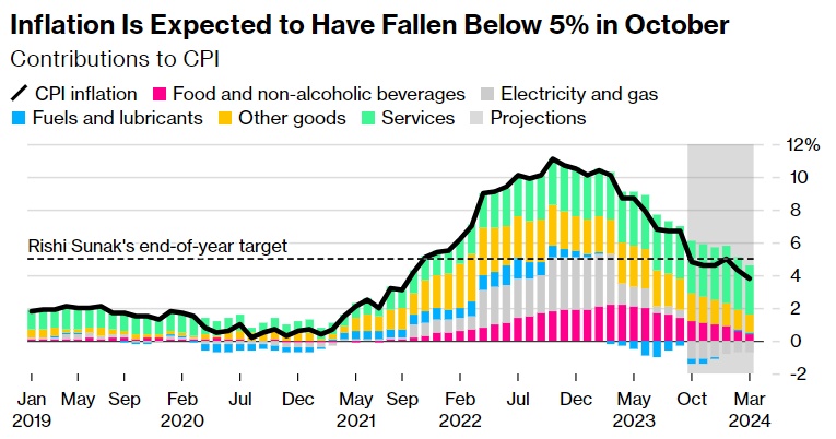英国央行预计10月份通胀率将降至4.8%,而经济学家预计降幅将略大,至4.7%。英国央行表示,预计今年通胀率将进一步放缓至4.5%。皮尔上周警告称,服务业仍是英国央行物价前景的“关键风险”。根据最新发布的数据,该分项指标9月份出人意料地从6.8%加速至6.9%。