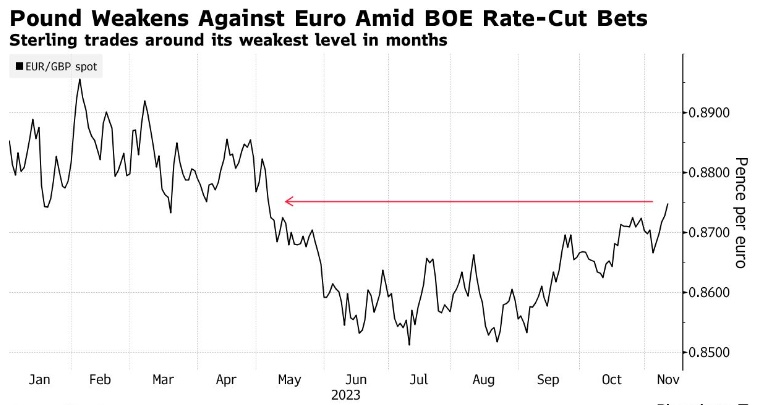 在英国央行实施了一场历史性的紧缩行动之后,交易员们越来越相信,英国央行的关键利率已经见顶。他们预测,政策制定者将从明年年中开始转向宽松政策,市场定价暗示,到2024年底,英国央行将降息近25个基点。