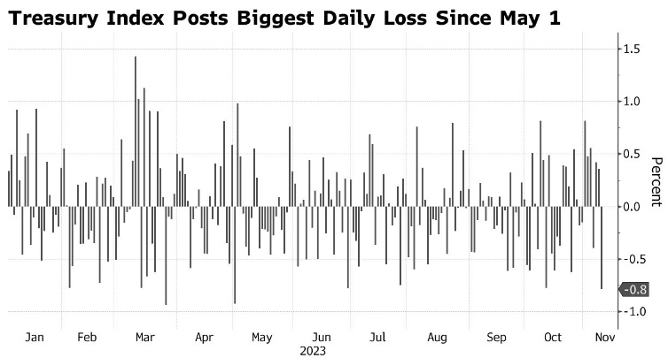 尽管收益率仍低于上月的峰值,但市场仍在波动,上周四30年期美国国债拍卖需求异常疲软后迅速爆发的抛售就是明证。截至11月9日,美国国债的一个广泛指数今年下跌了1.3%,2022年和2021年的跌幅分别达到了前所未有的12.5%和2.3%。