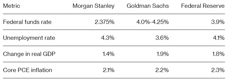以下是摩根士丹利和高盛对2025年美国经济数据的部分预测,以及美联储官员9月份预测的中位数: