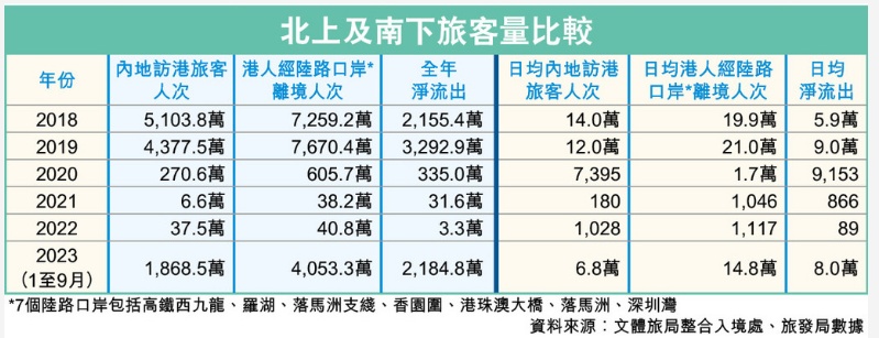 资料显示,最近5年全年港人北上客量,均多于内地陆路入境香港客量,当中2019年净流出量最高,近3,300万人次;即使疫情期间2021年、2022年亦分别有31.6万及3.3万人次净流出。