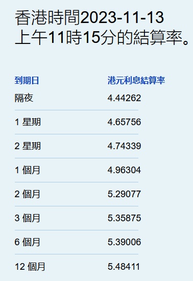 智通财经APP获悉,11月13日,港元拆息几乎全线走低,仅三个月期连升六天,报5.35875%,续创逾三个月新高,并较同期美元Libor低28点子。对利率最敏感的隔夜息降至4.44262%,而与楼按相关的一个月拆息亦中止三连升,报4.96304%。