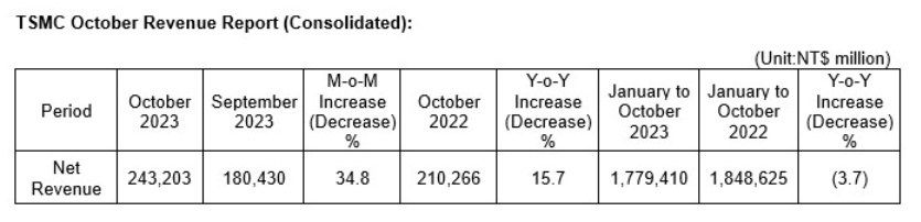 智通财经APP获悉,11月10日,台积电(TSM.US)公布2023年10月营收报告。数据显示,台积电10月合并营收为新台币2432.03亿元,环比增长34.8%、同比增长15.7%。这是台积电自今年2月以来月度营收的首次同比正增长,突显出全球芯片市场似乎正逐渐从低谷中复苏。受此消息提振,台积电美股上周五收涨6.35%,创下5月份以来的最大单日涨幅。