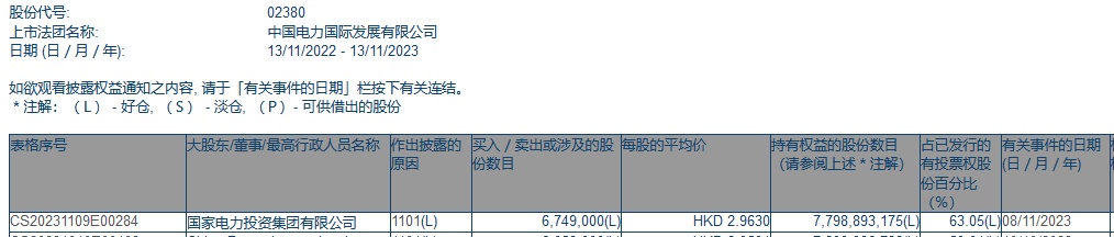 智通财经APP获悉,香港联交所最新资料显示,11月8日,国家电力投资集团有限公司增持中国电力(02380)674.9万股,每股作价2.9630港元,总金额约为1999.73万港元。增持后最新持股数目约为77.99亿股,最新持股比例为63.05%。