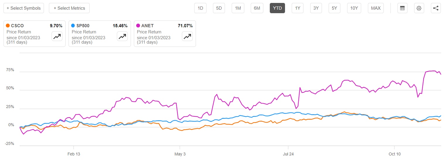 自思科第四财季财报发布以来,该公司股价一直呈下跌趋势,很大程度上因为这家互联网时代奠基者、网络设备行业老牌巨头无明显的AI催化剂、疲弱的业绩指引以及整体市场多头情绪低迷共同导致思科,以及美股基准指数——标普500指数,在此期间表现平平。思科股价今年以来涨幅不到10%,不及标普500指数年内15%的这一涨幅数字。