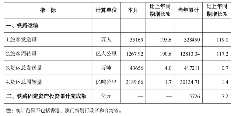 智通财经APP获悉,11月13日,国家铁路局发布2023年10月份全国铁路主要指标完成情况。数据显示,10月全国铁路发送旅客35169万人,同比增长195.6%。铁路固定资产投资累计完成5726亿元,同比增长7.2%。