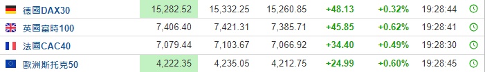 2. 截至发稿,德国DAX指数涨0.32%,英国富时100指数涨0.62%,法国CAC40指数涨0.49%,欧洲斯托克50指数涨0.60%。