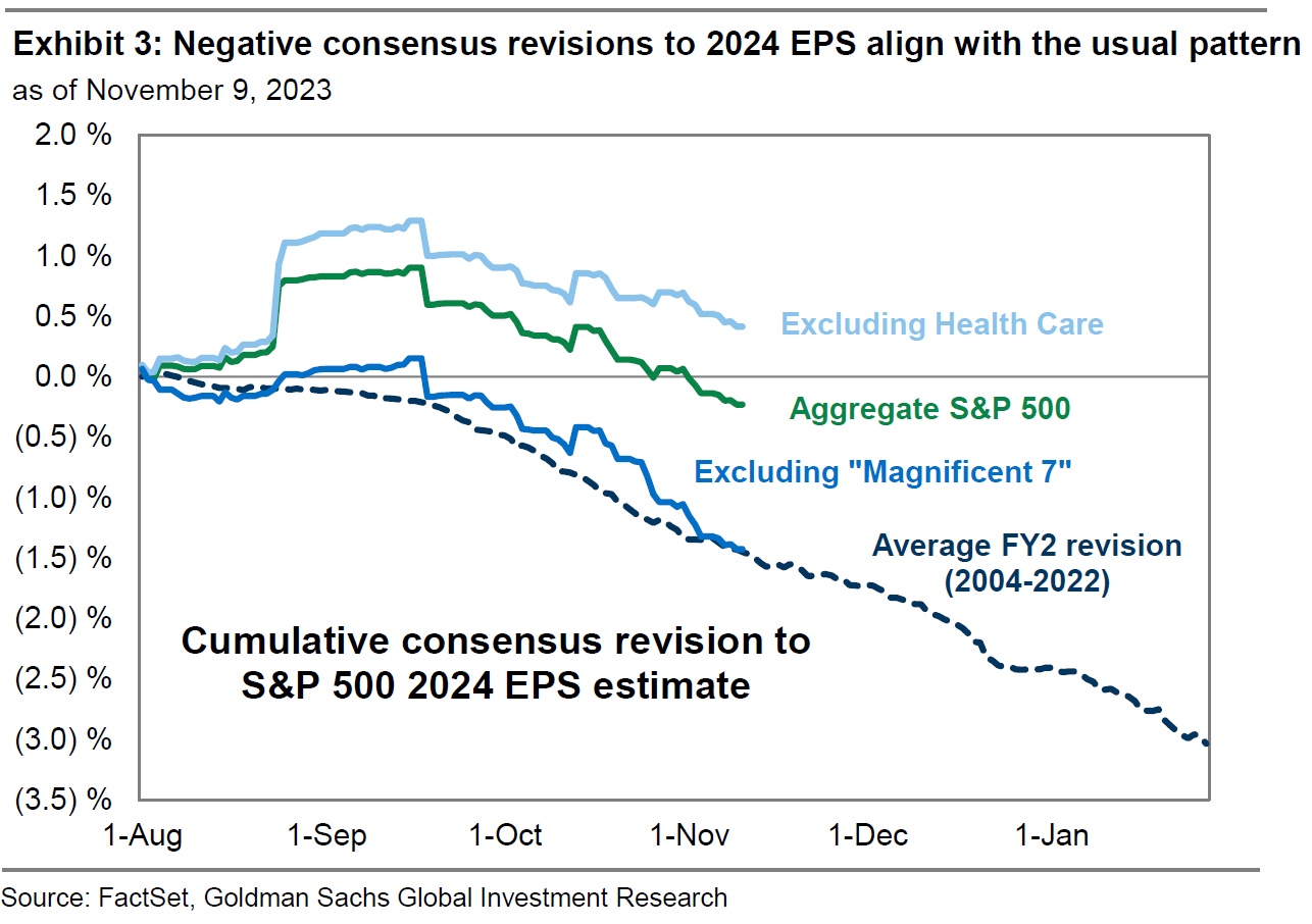 高盛的策略师们在11月10日发布的报告中写道:“许多投资者担心盈利预期被下调,然而,他们正在跟随这一典型模式,并且医疗保健板块的疲软EPS同比预期进一步拖累标普500指数成分公司整体EPS。”