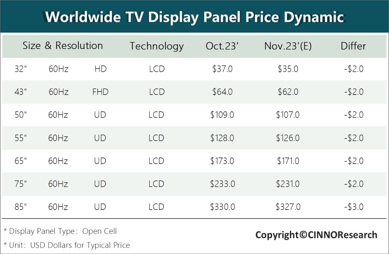 CINNO Research预计,11月LCD TV面板供应仍将呈现宽松局面,32"~85"各主要尺寸面板价格,总体相比10月价格分别下降2~3美元,不过在一些二线和渠道市场,库存小尺寸产品的报价跌幅可能还会明显超过这一水平。