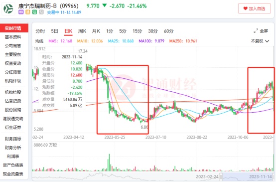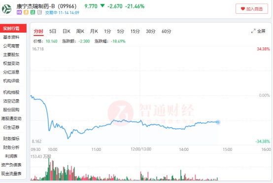 11月14日,康宁杰瑞制药-B(09966)股价出现崩盘,开盘后半小时内资金出逃规模近2亿港元,一个小时内公司股价放量暴跌达30%。