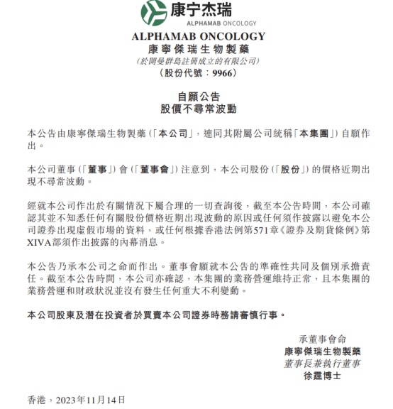 由此不难理解投资者在11月14日出现的恐慌情绪,即担心5月18日的大资金提前出逃现象再度重演。因为不论从宏观市场层面还是公司临床相关的消息面,均未出现重大利空信息,且康宁杰瑞也发布公告表示对股价波动毫不知悉。