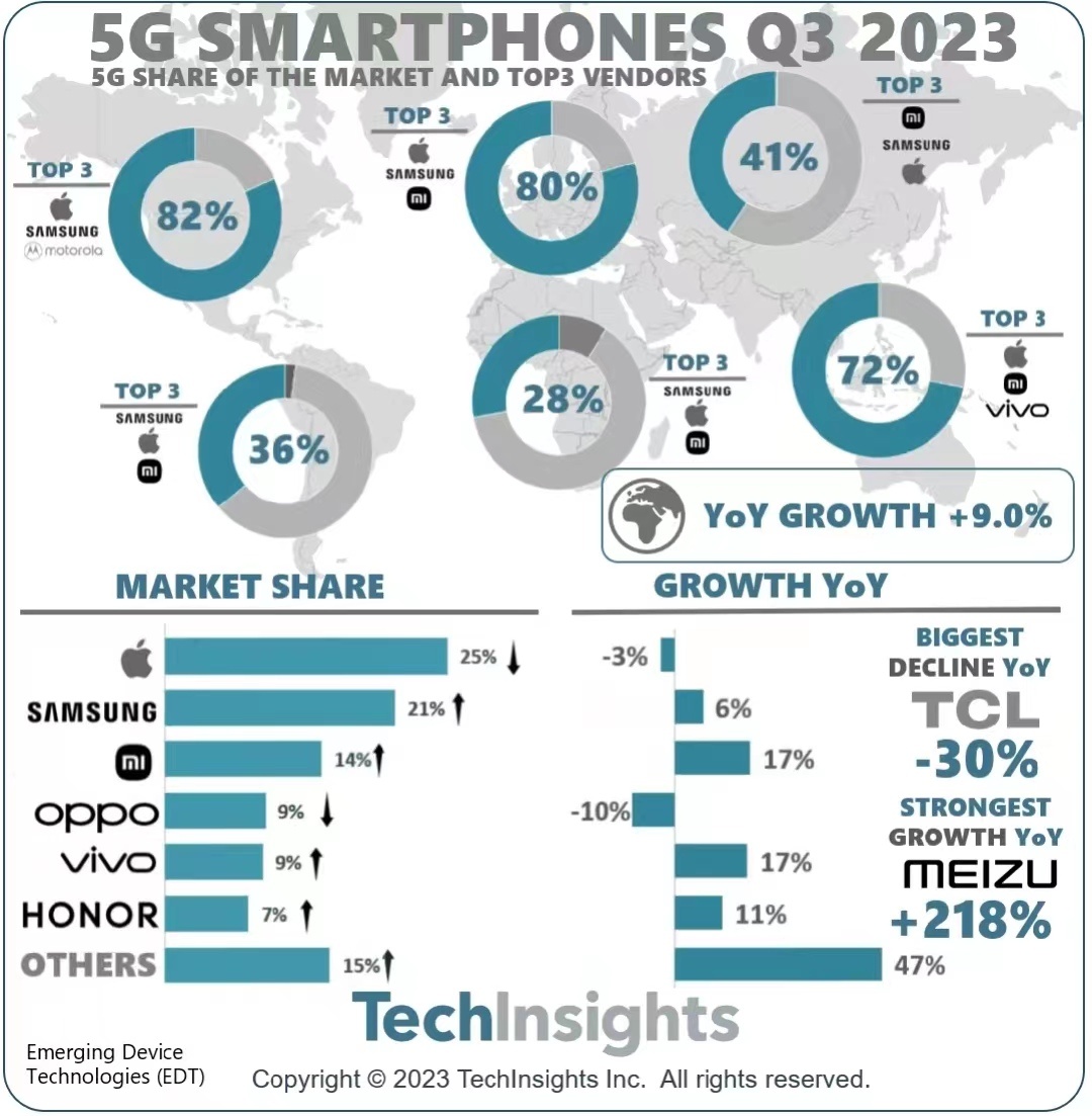 智通财经APP获悉,TechInsights发文称,2023年Q3全球5G智能手机出货量同比连续第五个季度出现个位数的变化,5G智能手机市场已经进入停滞期。发达市场已经饱和。下一个增长预计来自新兴市场,但增长速度将较慢。