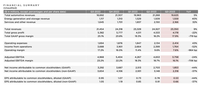 然而,特斯拉最近股价下跌的关键在于其最新的毛利率数据,该数据显示,该公司最近第三季度的盈利环比下滑。特斯拉第三季度毛利率下降至17.9%,同比下降719个基点,环比下降30个基点。这是特斯拉今年决定下调入门级Model 3和Y的价格以刺激需求的结果。
