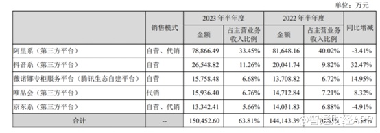 按平台划分来看,上半年阿里系仍是最大的销售收入平台,销售总额达到7.88亿元,同比下降3.41%,占主营收入比重的33.45%,较2022年上半年下降6.57个百分点。阿里系下降的同时,抖音系则实现高速增长,上半年同比增长32.47%至2.65亿元。表明贝泰妮线上渠道收入结构持续得到优化,不再单一依赖阿里系。