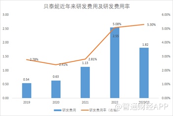 在研发投入方面,近年来贝泰妮持续加大研发投入,由2019年的0.54亿元一路攀升至2023年上半年的1.82亿元,研发费用率也达到5.3%,处于行业领先地位。