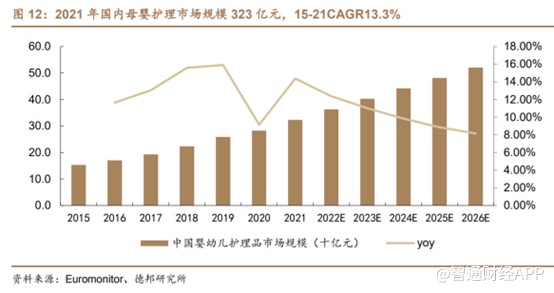 2015-2021年,国内电商红利提升消费便捷度、营销升级提高消费转化率、科学精细育儿提高消费意愿,加之背后消费能力的支撑,婴幼儿护理品市场规模由153亿元升至323亿元,CAGR13.3%,高于整体化妆品市场同期增速3pcts,预计2022-2026年将以9.46%的复合增速于2026年增至521亿元。