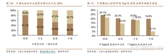 与国外相比,国内护肤品行业起步较晚,发展初期国际品牌凭借先进入优势与市场教育,迅速占领市场并成为行业主导,2020年,国内化妆品行业国货占比不足50%,Top5本土集团占比仅为5.1%,参照国外成熟市场仍有较高的本土替代空间。如今,国货品牌因对国人肤质更高的契合度;加上研发投入驱动产品力、创新性的提升;对国内市场、渠道、营销方式演变的深入洞察以及民族自信与国潮兴起等因素的共同驱使而发力迅猛,竞争格局交替重塑预计将兴未来较长时间内行业发展主基调,护肤品及细分市场国货崛起主导态势确定性强。