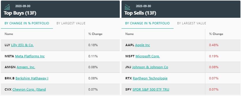从持仓比例变化来看,前五大买入标的分别是:礼来(LLY.US)、Meta Platforms、安进(AMGN.US)、伯克希尔哈撒韦-B以及雪佛龙(CVX.US)。
