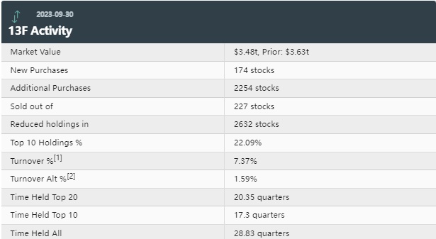 统计数据显示,贝莱德Q3持仓总市值达3.48万亿美元,上一季度持仓总市值为3.63万亿美元,环比下降4%。贝莱德在第三季度的持仓组合中新增了174只个股,增持了2254只个股;同时减持了2632只个股,清仓了227只个股。其中,前十大持仓标的市值占贝莱德美股持仓总市值的22.09%。