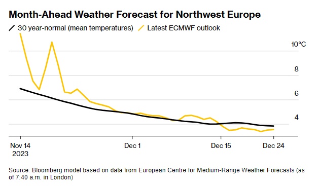 据气象预报公司Maxar Technologies Inc.称,反常的温和天气预计将在欧洲大陆大部分地区延续至11月底,从而减少供暖需求。在英国部分地区,风暴Debi带来强风,引发天气警报,这推动了该国的可再生能源发电,进一步减少了电力行业的天然气使用量。
