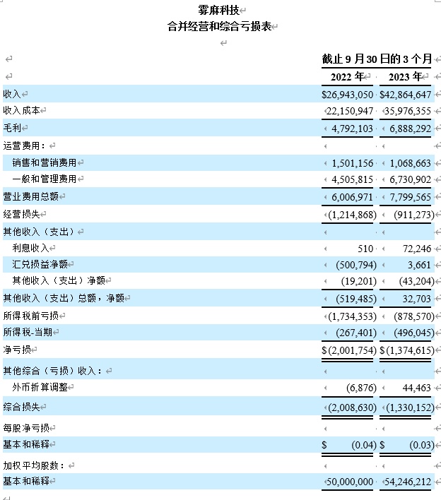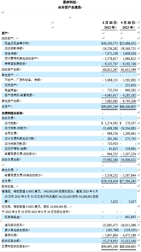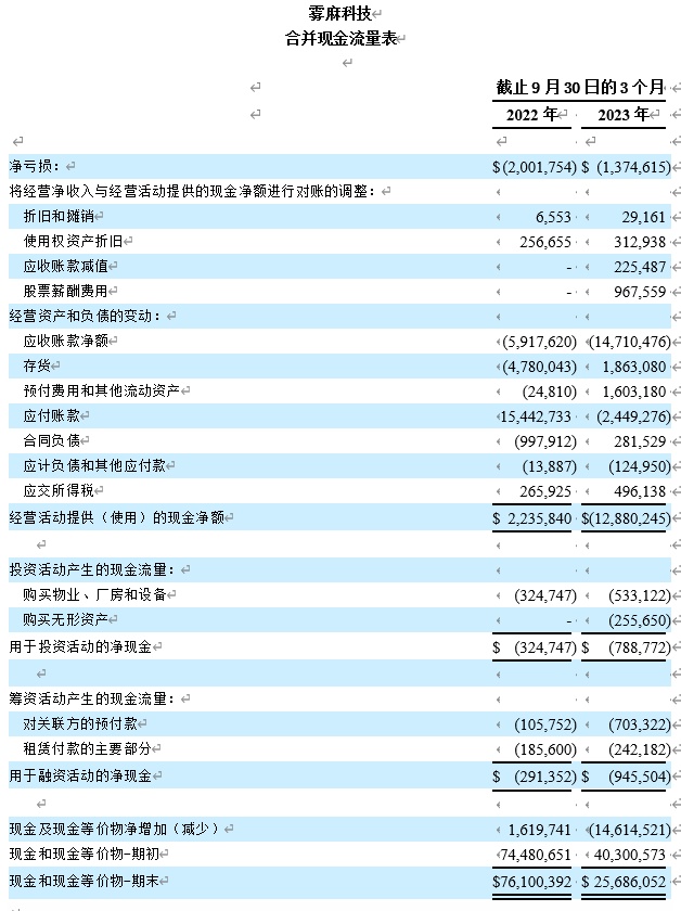 截至2023年9月30日,雾麻科技的现金和现金等价物为2570万美元,营运资金为2760万美元。