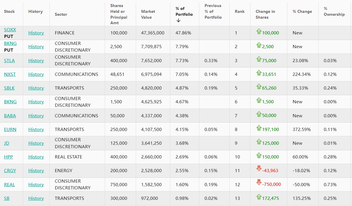 在前五大重仓股中,iShares费城半导体ETF看跌期权(SOXX.US,PUT)位列第一,持仓10万股,持仓市值4736.50万美元,占投资组合比例为47.86%,为三季度新增持股。