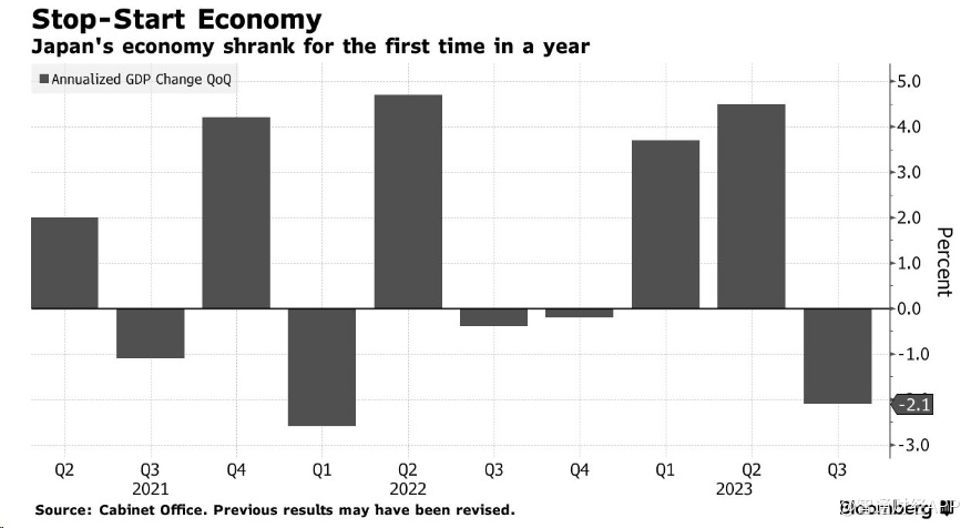 智通财经APP获悉,今年夏天日本经济出现萎缩,这表明在货币疲软、长期通胀和海外经济前景不明朗等不确定因素面前,日本经济复苏十分脆弱。周三公布的官方数据显示,日本第三季度国内生产总值(GDP)折合成年率收缩2.1%,主要原因是企业支出下降和进口增加拖累了经济。收缩幅度比经济学家预测的0.4%还要大。