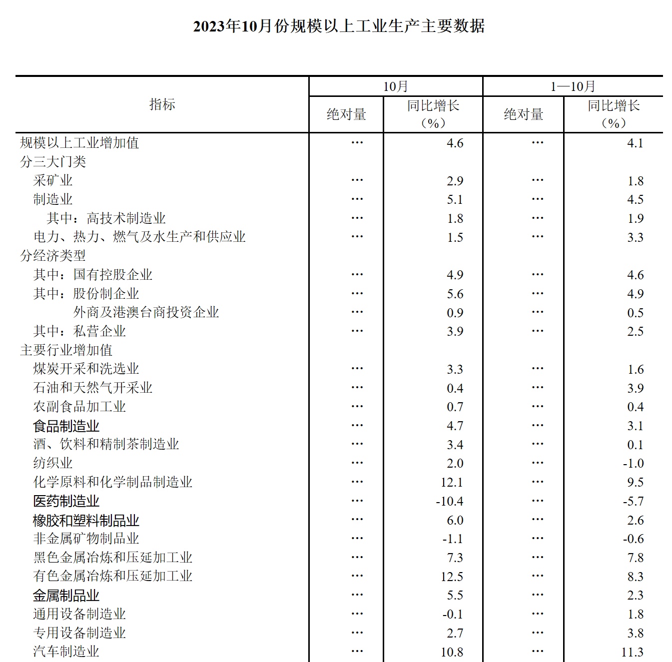 智通财经APP获悉,11月15日,国家统计局公布的数据显示,10月份,规模以上工业增加值同比实际增长4.6%(增加值增速均为扣除价格因素的实际增长率)。从环比看,10月份,规模以上工业增加值比上月增长0.39%。1—10月份,规模以上工业增加值同比增长4.1%。