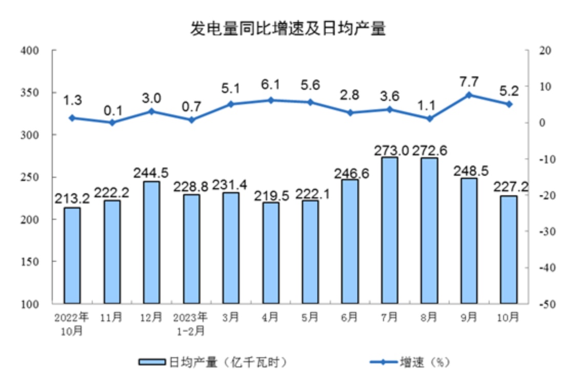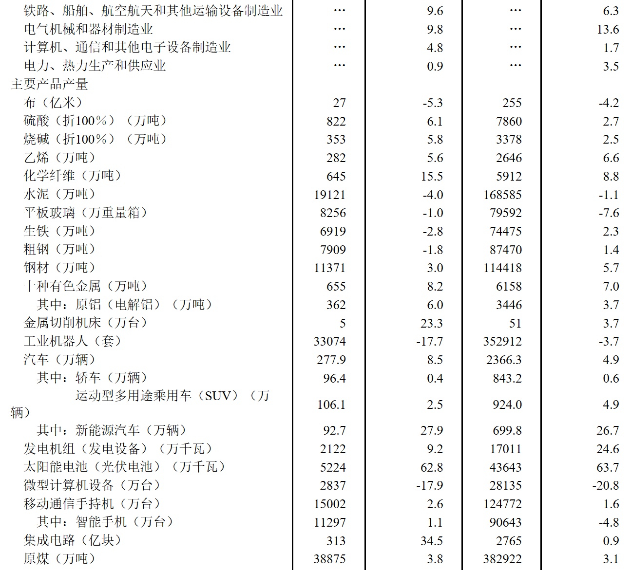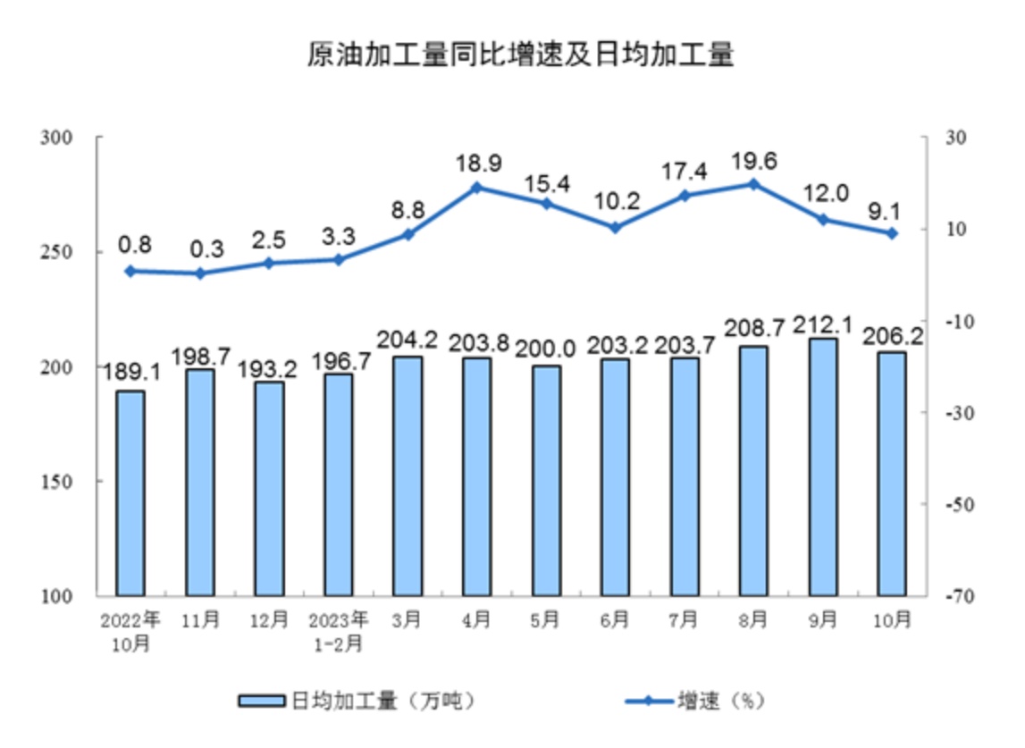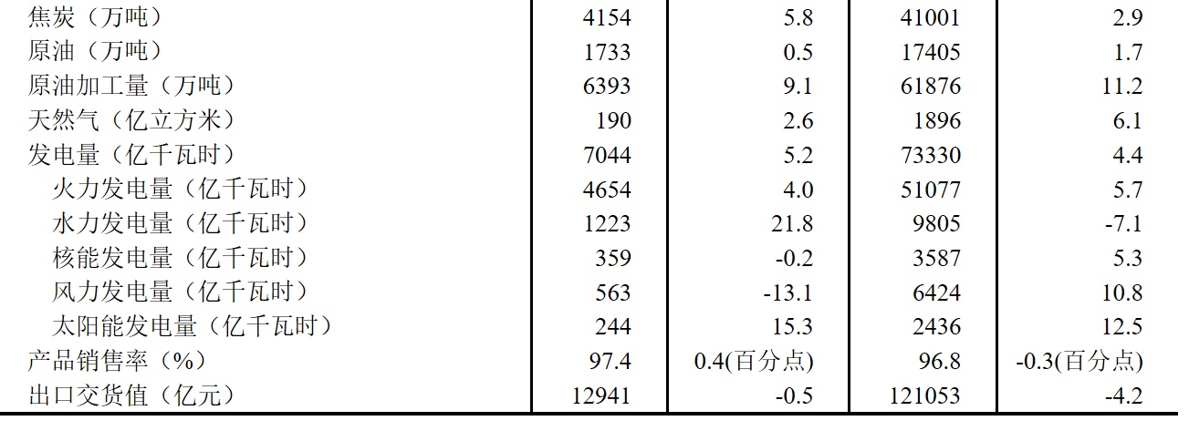 分产品看,10月份,620种产品中有371种产品产量同比增长。钢材11371万吨,同比增长3.0%;水泥19121万吨,下降4.0%;十种有色金属655万吨,增长8.2%;乙烯282万吨,增长5.6%;汽车277.9万辆,增长8.5%,其中新能源汽车92.7万辆,增长27.9%;发电量7044亿千瓦时,增长5.2%;原油加工量6393万吨,增长9.1%。