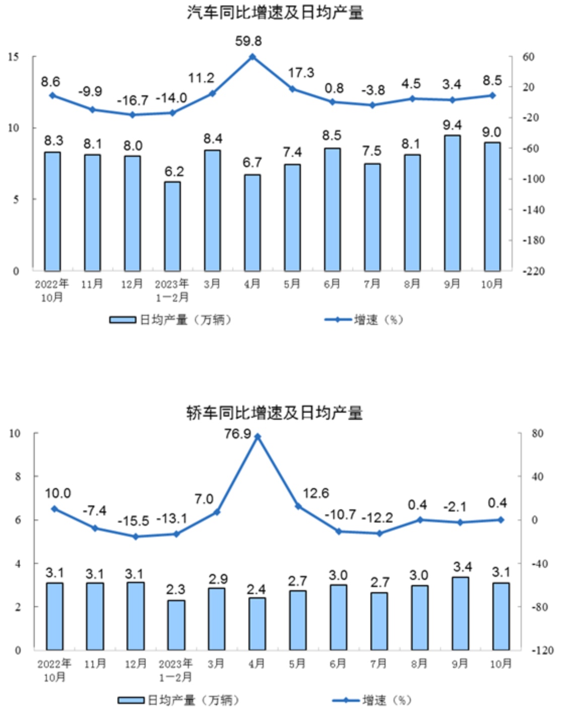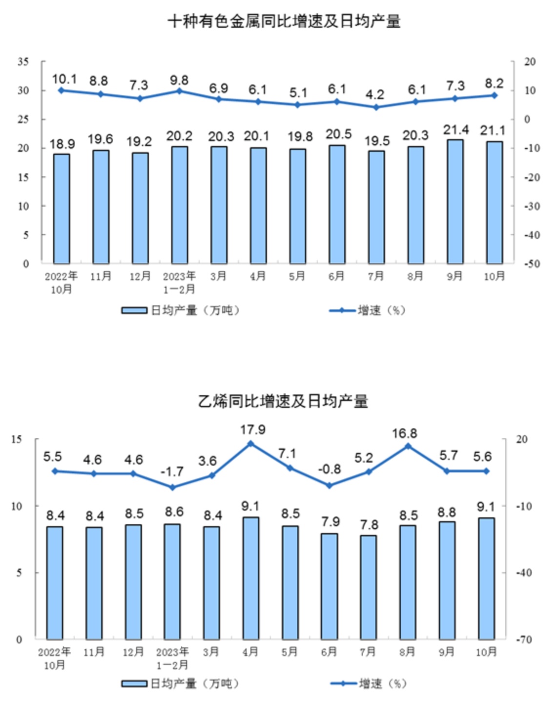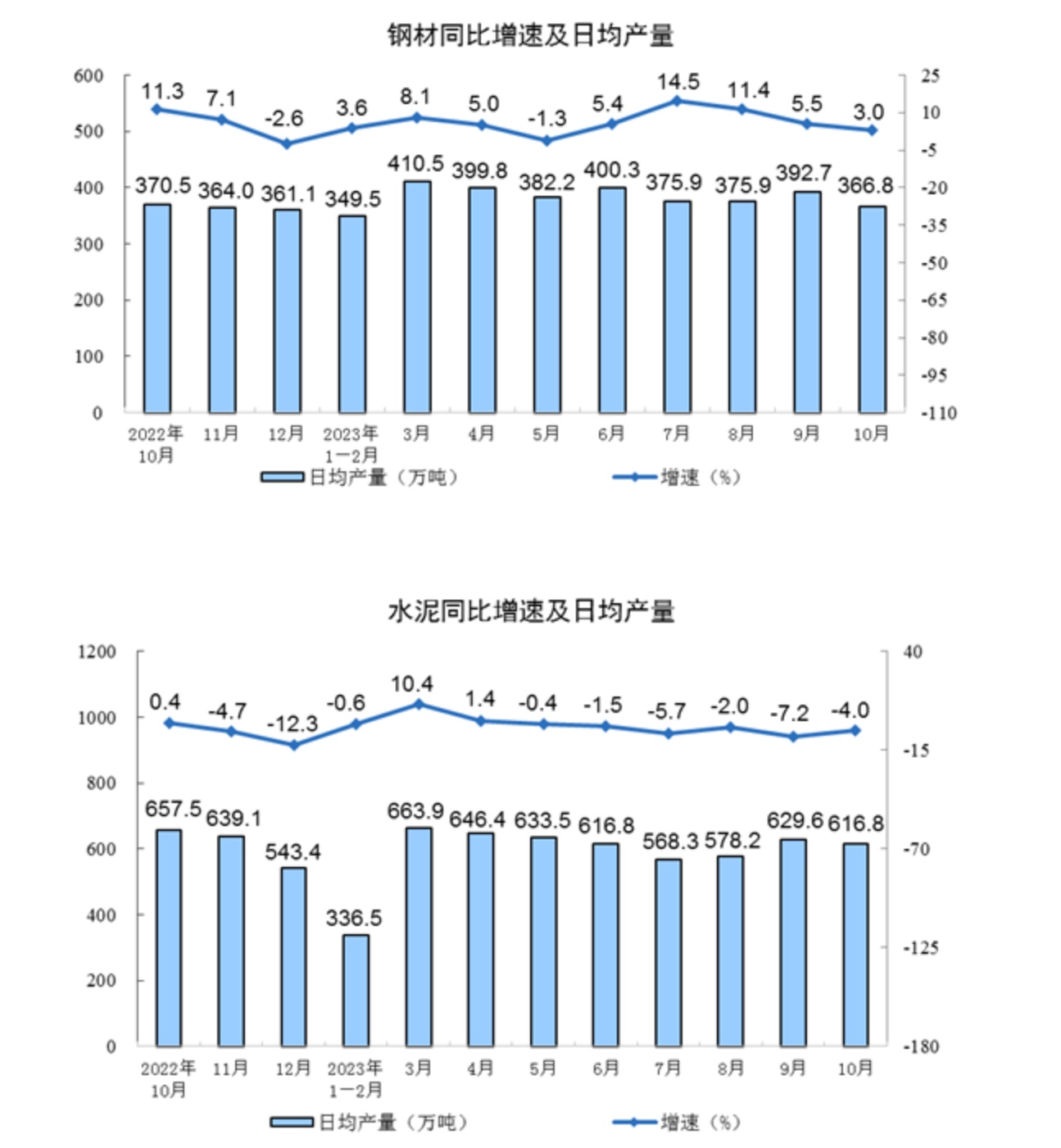 分产品看,10月份,620种产品中有371种产品产量同比增长。钢材11371万吨,同比增长3.0%;水泥19121万吨,下降4.0%;十种有色金属655万吨,增长8.2%;乙烯282万吨,增长5.6%;汽车277.9万辆,增长8.5%,其中新能源汽车92.7万辆,增长27.9%;发电量7044亿千瓦时,增长5.2%;原油加工量6393万吨,增长9.1%。