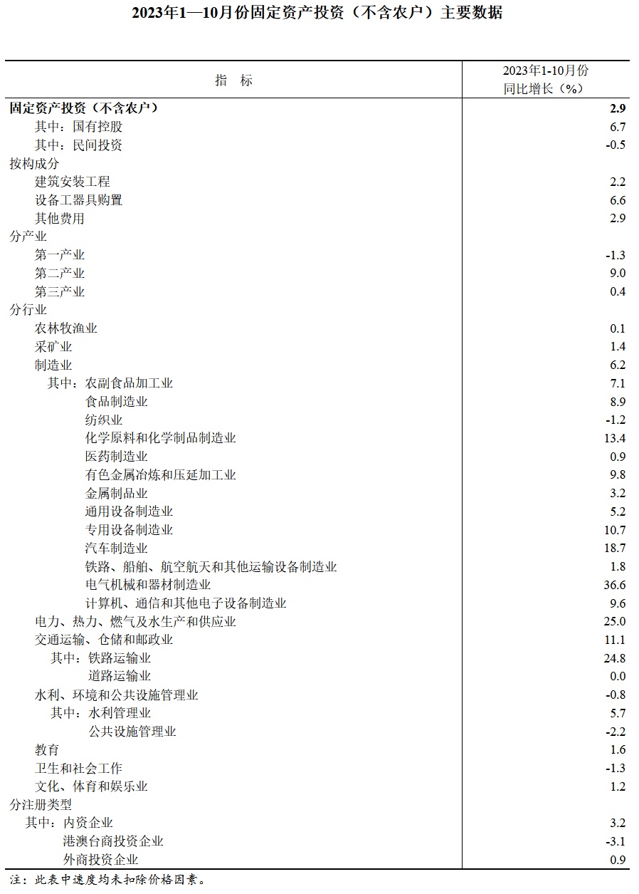智通财经APP获悉,11月15日,据国家统计局披露,1-10月份,全国固定资产投资(不含农户)419409亿元,同比增长2.9%(按可比口径计算)。其中,民间固定资产投资215863亿元,同比下降0.5%。从环比看,10月份固定资产投资(不含农户)增长0.10%。
