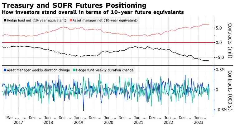 在截至11月7日的一周内,对冲基金在2年期和5年期美债期货的净空头头寸每增加一个基点的风险总计增加1030万美元,使该水平达到创纪录水平。资产管理公司尤其看空10年期美债期货,每基点净多头风险平仓约840万美元。整体而言,本周资产管理公司减少约2.9万份10年期美债净多头期货,而对冲基金净空头的仓位也大致相同。