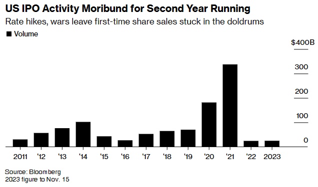 近两年来,美国IPO市场一直处于死气沉沉的状态。截至11月,美国证券交易所通过IPO筹集的资金水平为247亿美元,与2022年同期的239亿美元相近,但与2021年的辉煌时期相比,这一数字下降了92%。