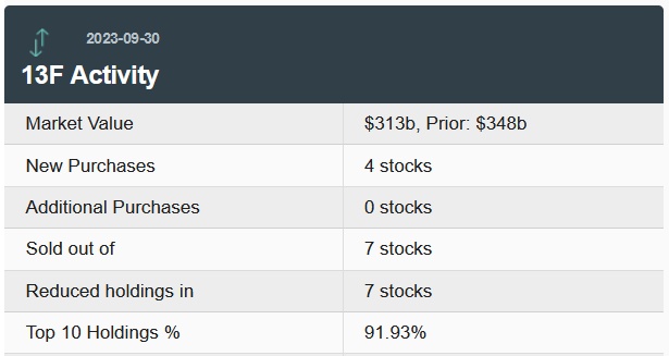 据统计,伯克希尔哈撒韦第三季度持仓总市值达3130亿美元,上一季度总市值为3480亿美元,环比下滑10%。伯克希尔在第三季度的持仓组合中新增了4只个股,增持了0只个股。同时,伯克希尔减持7只个股,清仓7只个股。其中,前十大持仓标的占总市值的91.93%。