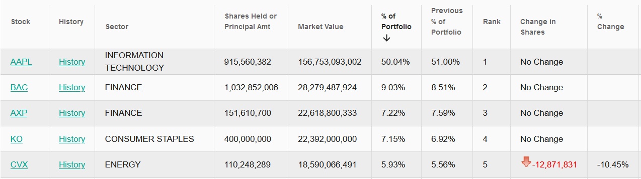 可口可乐(KO.US)位列第四,持仓4.00亿股,持仓市值约224亿美元,占投资组合比例为7.15%,持仓数量较上季度无变化。