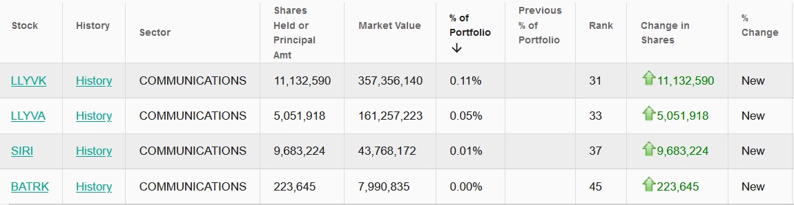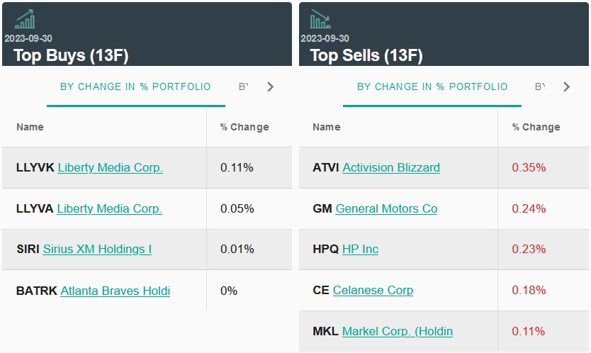 从持仓比例变化来看,前四大买入标的分别是:Liberty Live-C,Liberty Live-A,Sirius XM,Atlanta Braves-C。