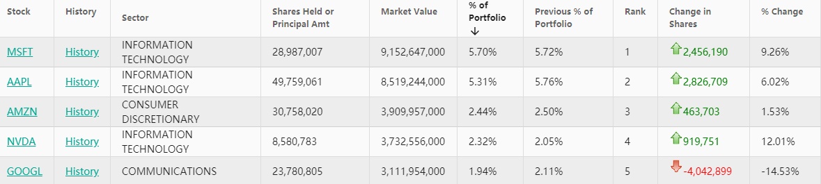 在前五大重仓股中,微软(MSFT.US)位列第一,持仓约2899万股,持仓市值约91.53亿美元,较上季度持仓数量上升9.26%,占投资组合比例为5.70%。