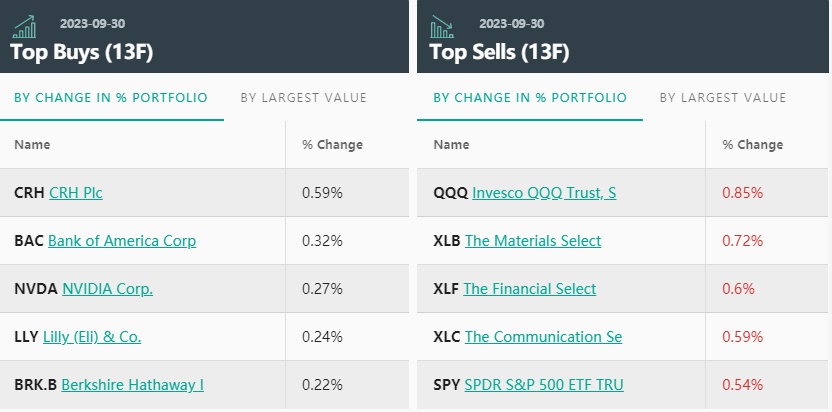 从持仓比例变化来看,前五大买入标的分别是:CRH水泥(CRH.US)、美国银行(BAC.US)、英伟达、礼来(LLY.US)、伯克希尔-B(BRK.B.US)。
