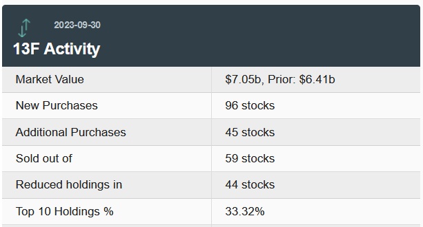 据统计,该基金第三季度持仓总市值达70.5亿美元,上一季度总市值为64.1亿美元,环比增长10%。该基金在第三季度的持仓组合中新增了96只个股,增持了45只个股。同时,该基金减持44只个股,清仓59只个股。其中,前十大持仓标的占总市值的33.32%。
