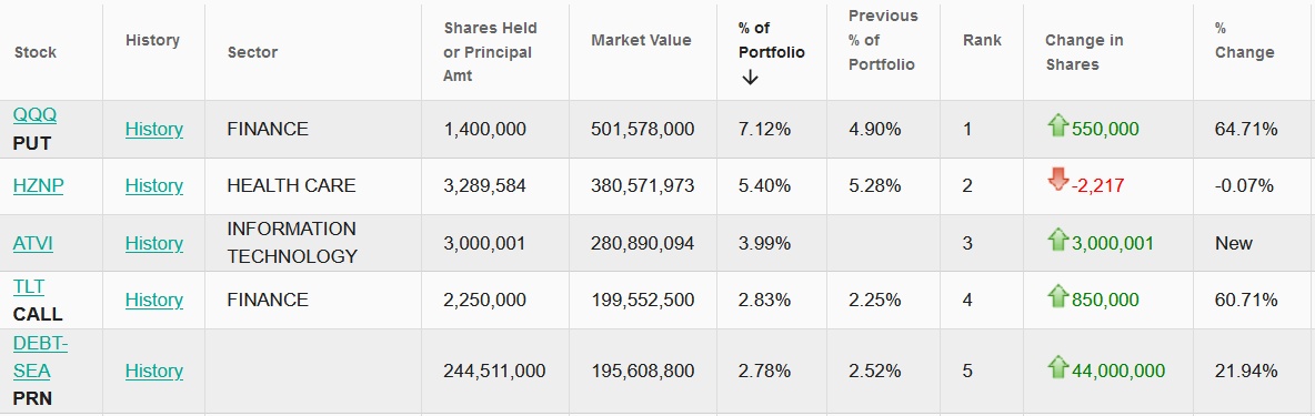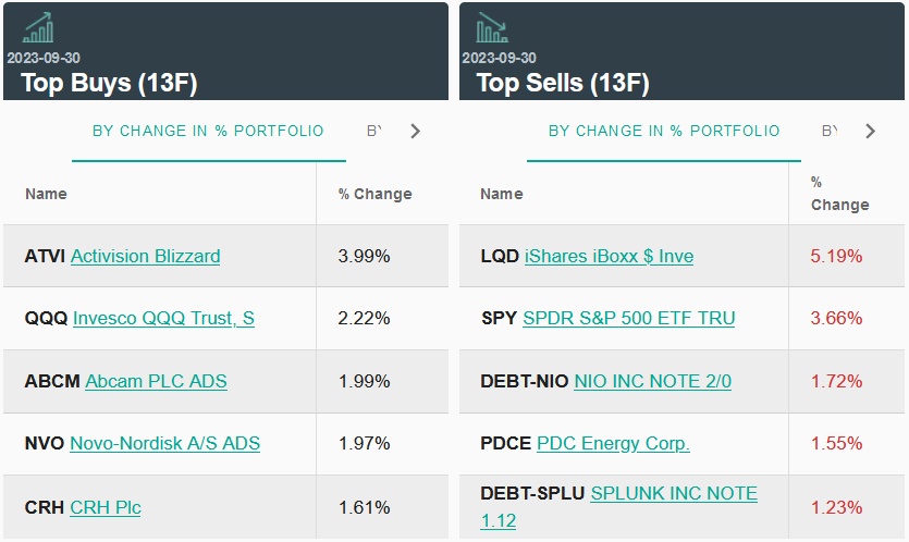 从持仓比例变化来看,前五大买入标的分别是:动视暴雪,Invesco纳斯达克100指数ETF看跌期权,生物技术公司Abcam(ABCM.US),诺和诺德(NVO.US),CRH水泥(CRH.US)。