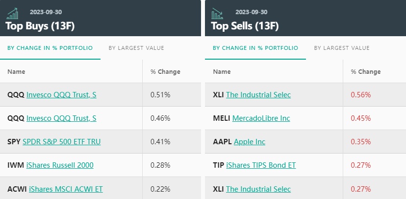 从持仓比例变化来看,买入的主要标的有纳指100ETF(QQQ.US)、标普500指数ETF、iShares罗素2000指数ETF(IWM.US)与iShares MSCI ACWI ETF(ACWI.US)。卖出的主要标的有SPDR工业指数ETF(XLI.US)、MercadoLibre(MELI.US)、苹果与iShares通胀债券指数ETF(TIP.US)。