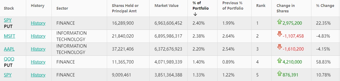 在前五大重仓股中,标普500指数ETF看跌期权(SPY.US,PUT)位列第一,持仓1629万股,持仓市值约为69.6亿美元,占投资组合比例为2.40%,持仓数量较上季度上升22.35%。
