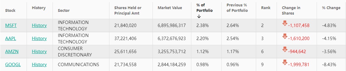 微软(MSFT.US)位列第二,持仓2184万股,持仓市值约为69亿美元,占投资组合比例为2.38%,持仓数量较上季度下降4.38%,连续第三个季度减持。