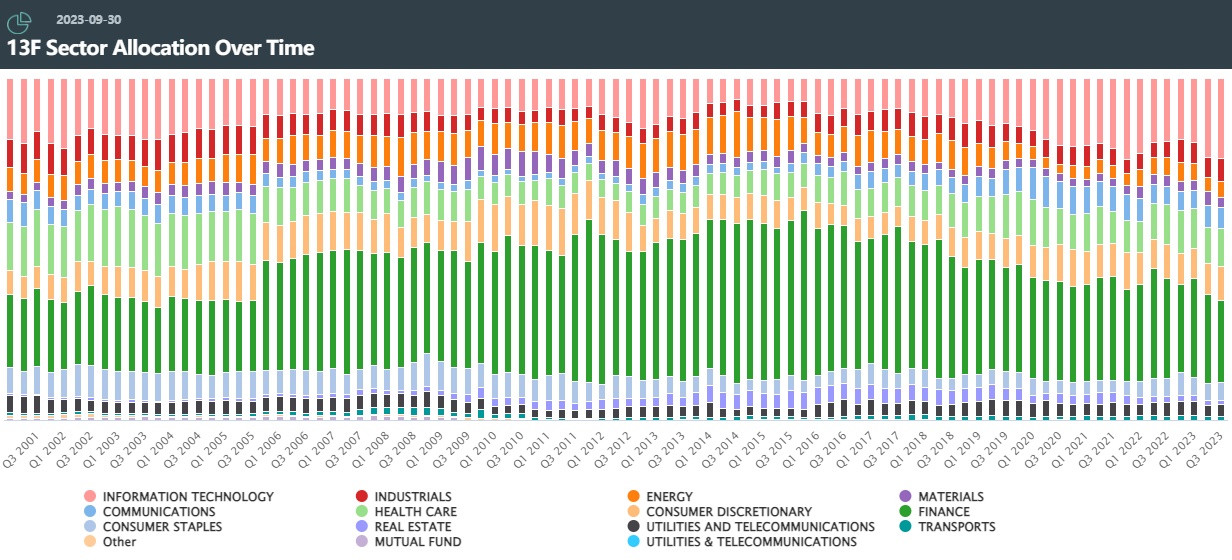 从持仓偏好来看,花旗最大持仓仍为金融类标的,但总持仓比例已经降至24.13%,其次为IT类标的,持仓占比为23.29%。从整体趋势来看,花旗近几个季度一直在增持IT类个股,减持金融类个股。
