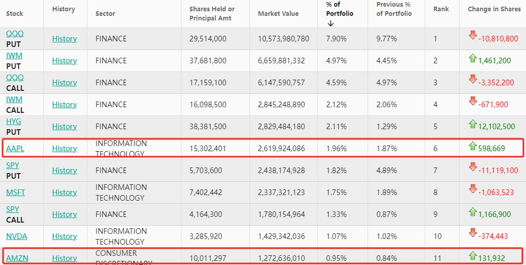 iShares iBoxx高收益公司债券指数ETF看跌期权(HYG.US,PUT)位列第五,持仓3838万股,持仓市值约为28.3亿美元,占投资组合比例为2.11%。
