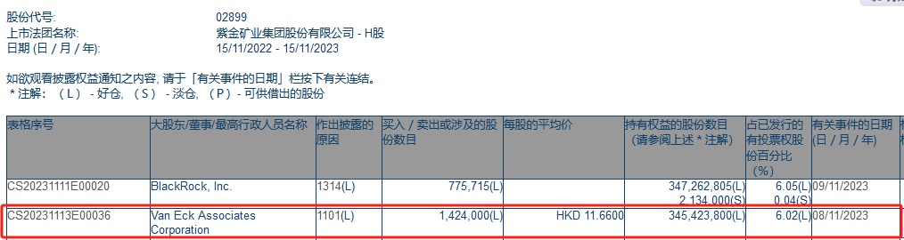 智通财经APP获悉,香港联交所最新资料显示,11月8日,Van Eck Associates Corporation增持紫金矿业(02899)142.4万股,每股作价11.66港元,总金额为1660.38万港元。增持后最新持股数目约为3.45亿股,最新持股比例为6.02%。