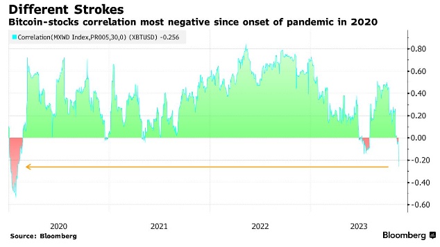 比特币与摩根士丹利资本国际公司全球股指的30天相关系数目前为负0.23,是自2020年初新冠疫情爆发以来的最大负相关系数。读数为1表示资产在同步移动,而-1则表示它们在相反方向移动。